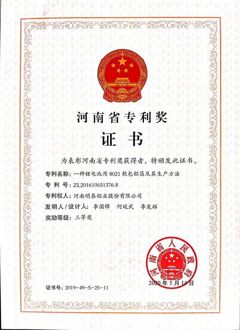 近日,河南省第二屆專利獎(jiǎng)評(píng)選結(jié)果正式揭曉,明泰鋁業(yè)自主研發(fā)的“一種鋰電池用8021軟包鋁箔及其生產(chǎn)方法”發(fā)明專利被授予“河南省專利獎(jiǎng)三等獎(jiǎng)”。