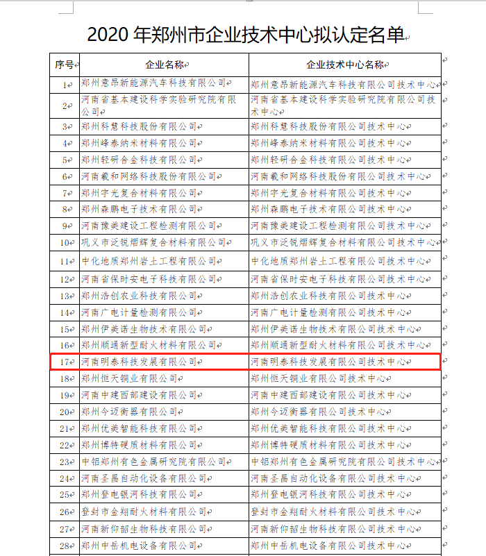 2020年8月4日,經(jīng)企業(yè)自主申報(bào)、縣(市、區(qū))推薦、專家評(píng)審和現(xiàn)場(chǎng)核查,河南明泰科技發(fā)展有限公司等61家企業(yè)符合《鄭州市認(rèn)定企業(yè)技術(shù)中心管理辦法》(鄭工信[2014]2號(hào))所規(guī)定的基本條件,擬認(rèn)定為2020年度鄭州市企業(yè)技術(shù)中心,鄭州市工業(yè)和信息化局將名單予以公示。