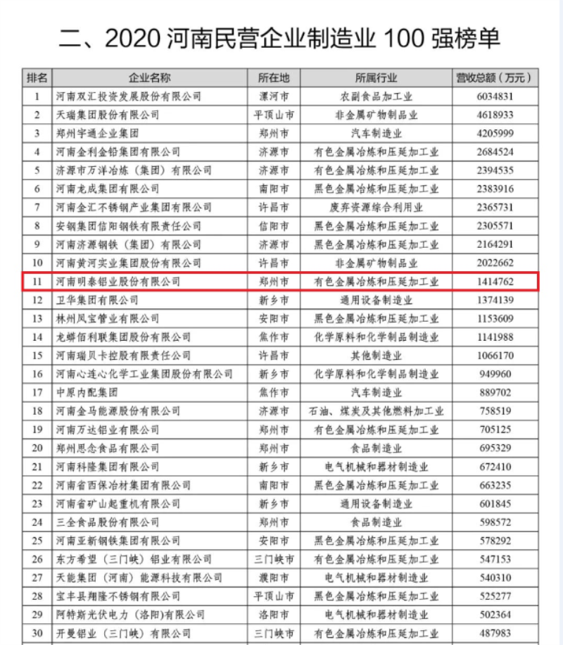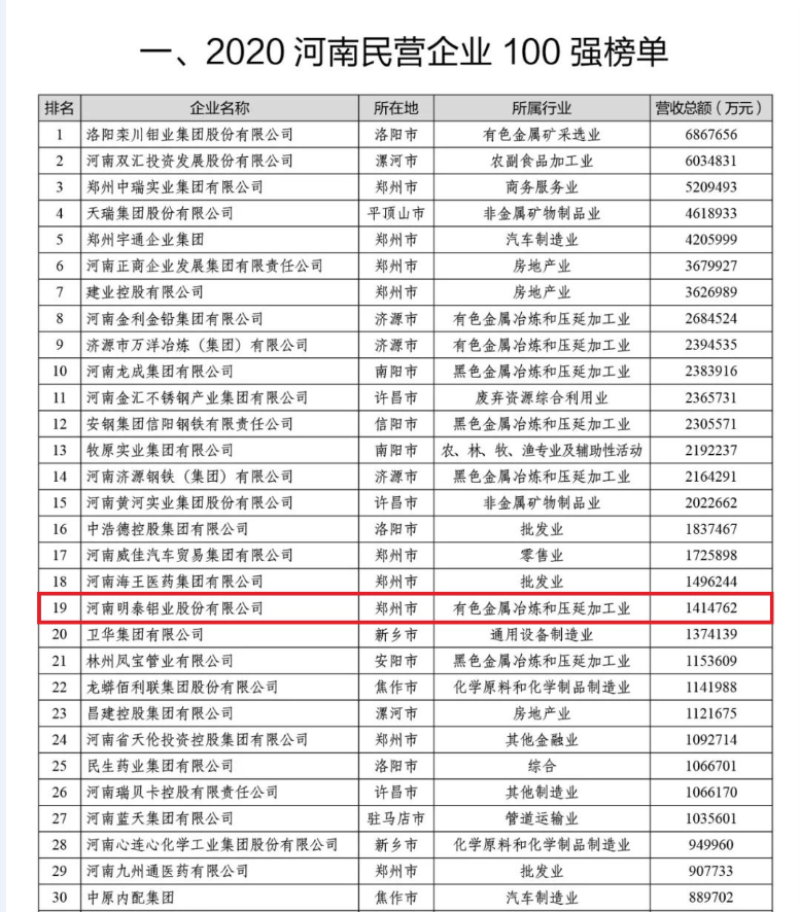 發(fā)布會上,明泰鋁業(yè)憑借141.4億的營業(yè)總額再次入選2020河南民營企業(yè)100強(qiáng)榜單和2020河南民營企業(yè)制造業(yè)100強(qiáng)榜單,分別位列第19位、第11位。近年來,明泰鋁業(yè)不斷深化產(chǎn)業(yè)結(jié)構(gòu)與升級,主動履行社會責(zé)任,加快企業(yè)邁向高質(zhì)量發(fā)展的步伐。又一次榮登雙百強(qiáng)榜單,是社會各界對明泰鋁業(yè)近年來快速發(fā)展的肯定,也標(biāo)志著明泰鋁業(yè)在全省民營企業(yè)中的重要作用和地位。